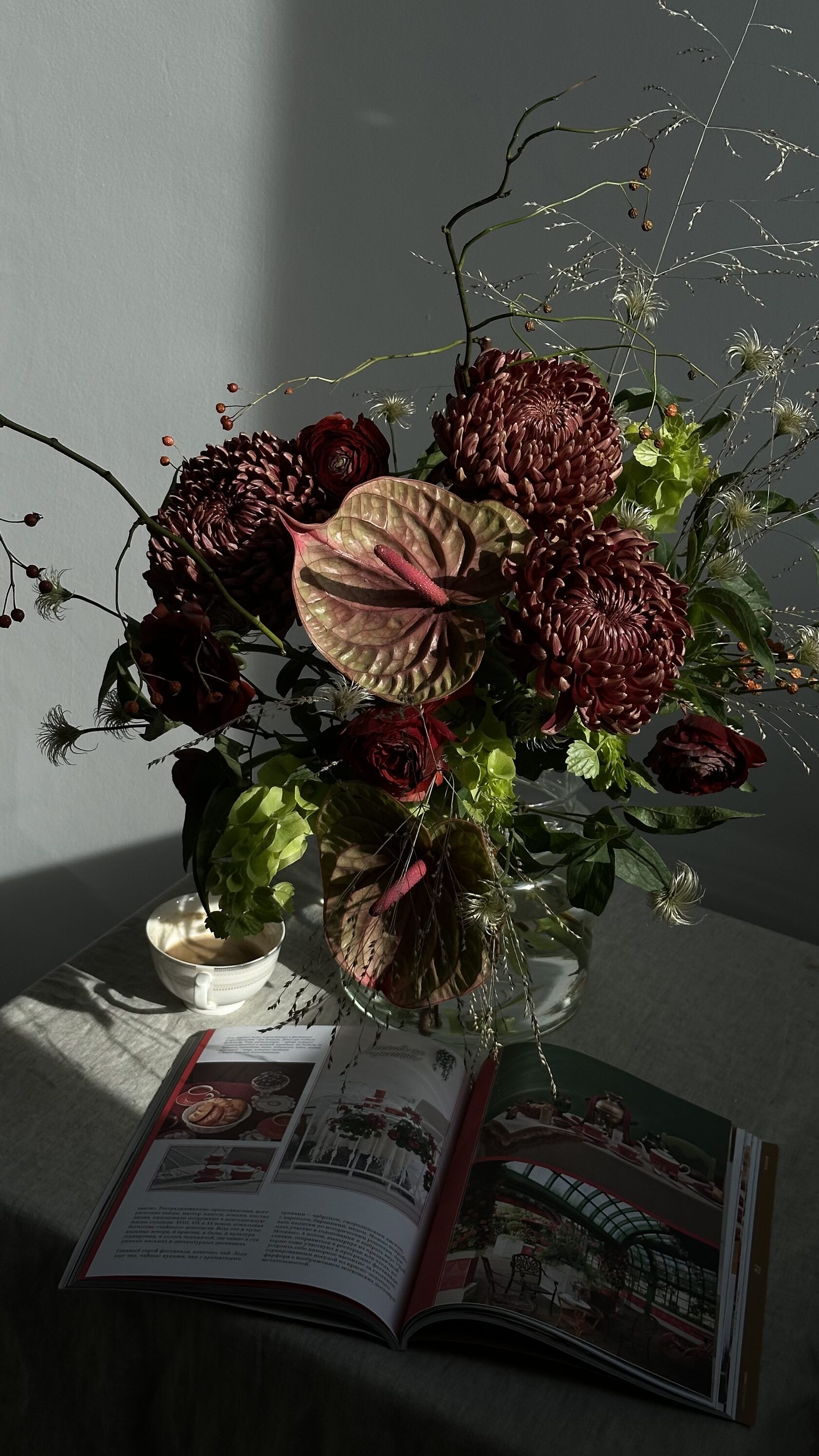 Их оттенки — тёплые, густые: янтарь, охра, вино. В букете хризантема — как шерстяной плед: создаёт уют и держит форму, даёт ощущение плотности и покоя.