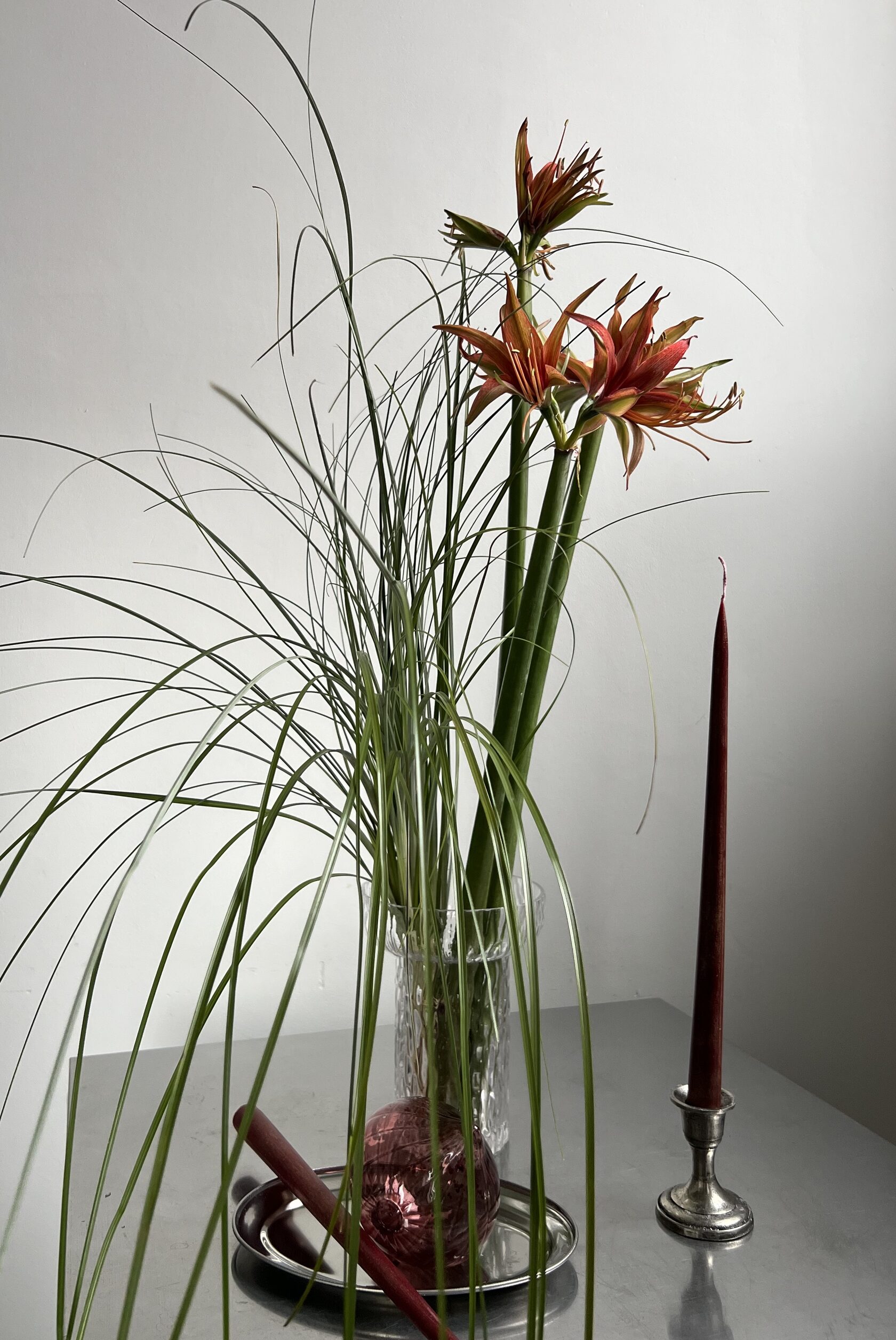 Амариллис. Элегантный, почти театральный. Один цветок — уже композиция. Его крупные бутоны словно светятся изнутри, придавая пространству торжественность. Хорош в минималистичных постановках: прозрачная цилиндрическая ваза, холодный свет, капля роскоши.