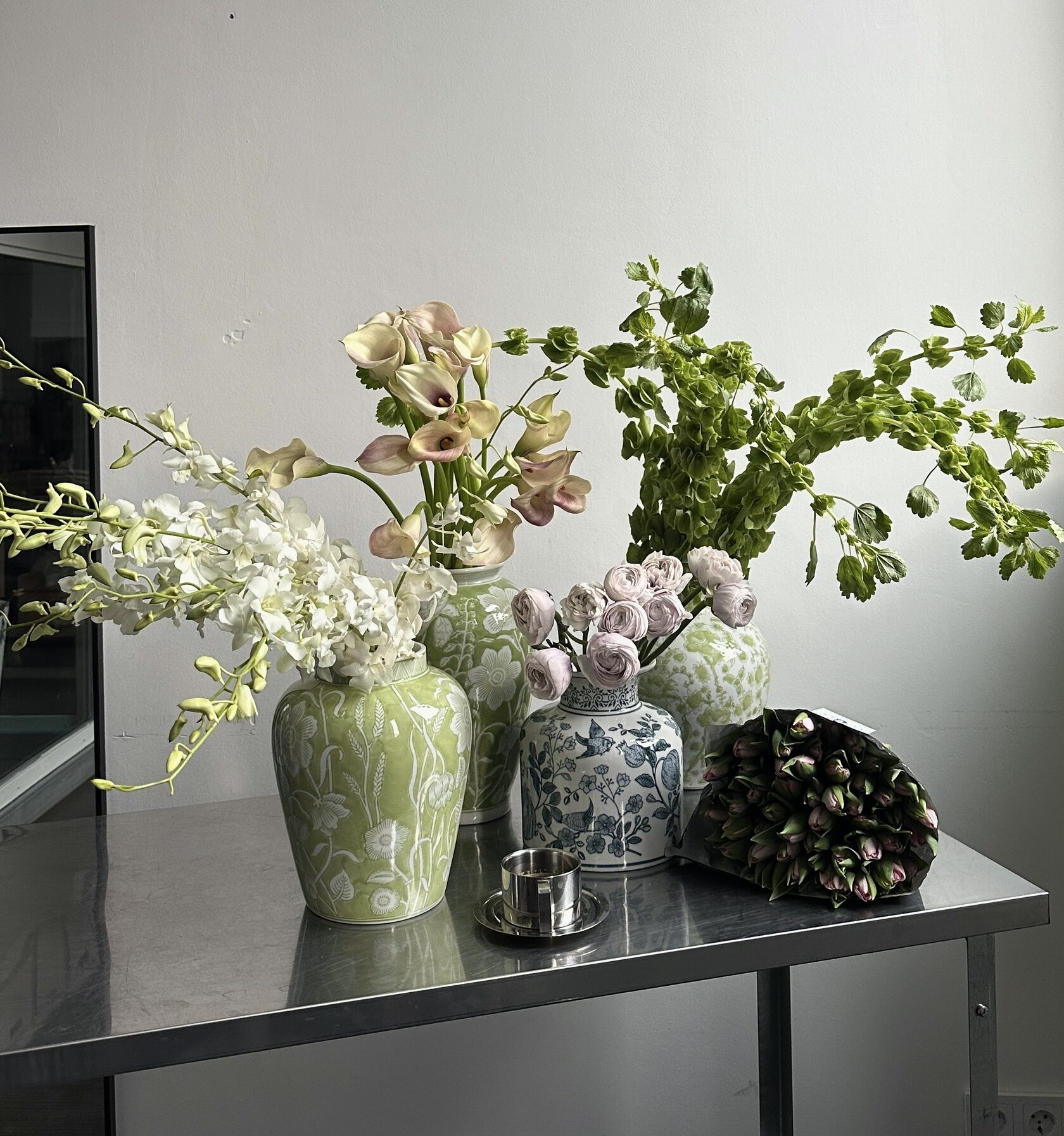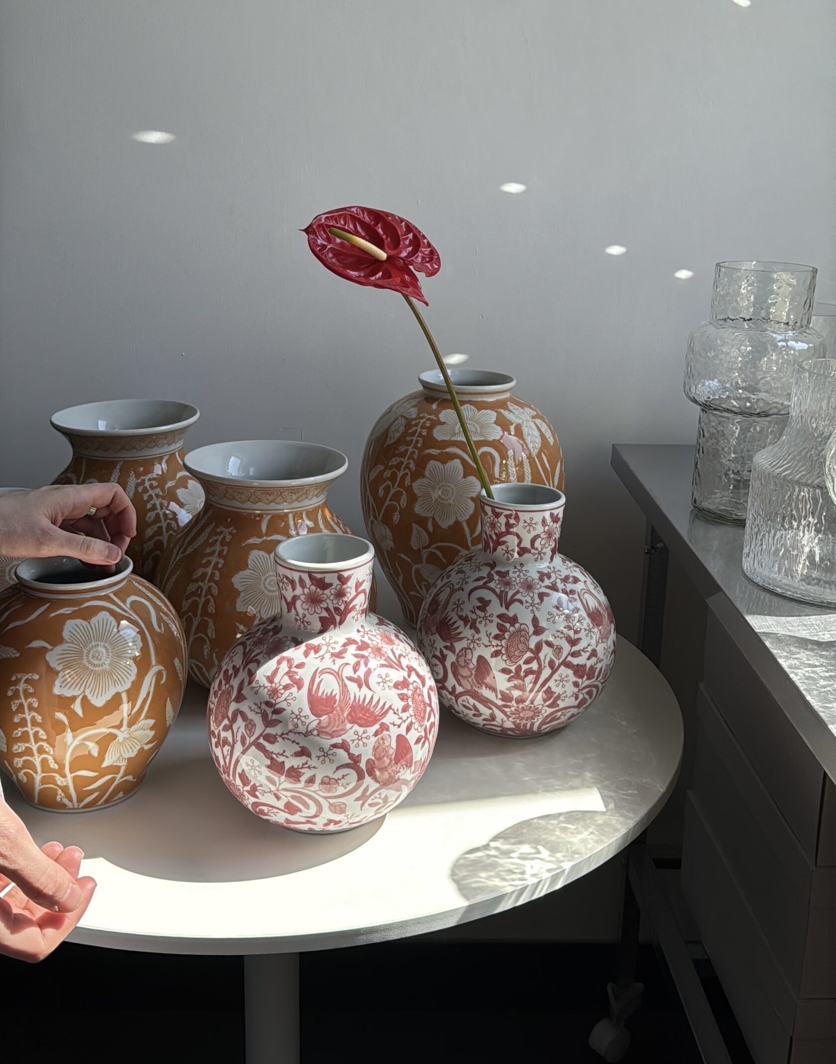 - Вторая — низкая керамическая, с широким горлом. В неё удобно ставить пионы, ранункулюсы или короткие ветки эвкалипта.